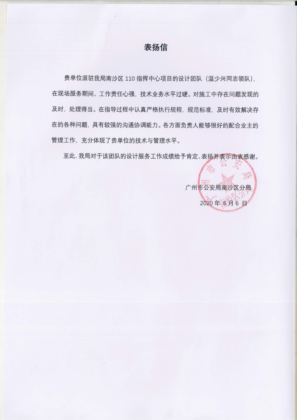 近日,廣州市公安局南沙區(qū)分局送來表揚(yáng)信,對我公司廣州市南沙公安分局110指揮中心裝修設(shè)計工程的設(shè)計團(tuán)隊給予表揚(yáng)。
