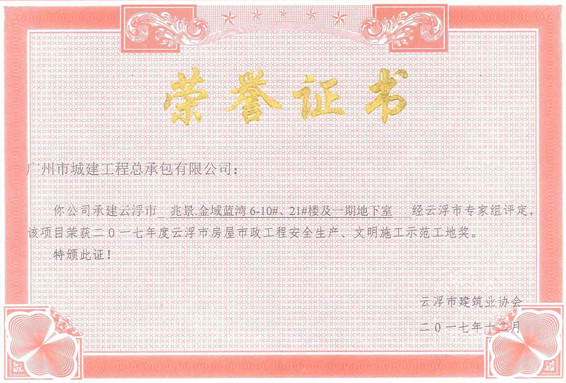 2018年1月,公司金域藍(lán)灣項(xiàng)目喜獲2017年度云浮市房屋市政工程安全生產(chǎn)、文明施工示范工地獎(jiǎng)。自金域藍(lán)灣項(xiàng)目開(kāi)工以來(lái),公司一直不斷加強(qiáng)安全文明管理力度,并成立了專門的督導(dǎo)組,從技術(shù)、現(xiàn)場(chǎng)、協(xié)調(diào)、...