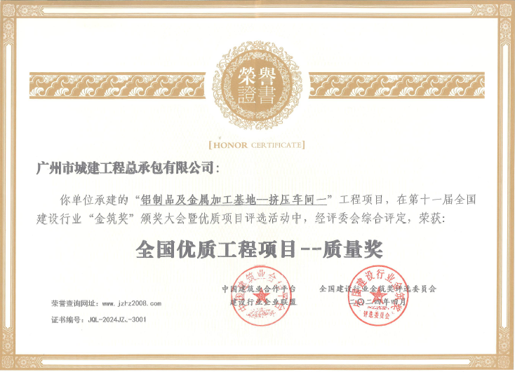 4月,公司積極參加全國(guó)建設(shè)行業(yè)“金筑獎(jiǎng)”評(píng)選活動(dòng),經(jīng)綜合評(píng)定,由公司承建的新興鳳鋁公司鋁制品及金屬加工基地--擠壓車間一工程項(xiàng)目榮獲第十一屆“金筑獎(jiǎng)”全國(guó)優(yōu)質(zhì)工程項(xiàng)目——質(zhì)量獎(jiǎng)。 公司秉承“高標(biāo)準(zhǔn)、高質(zhì)量、優(yōu)...