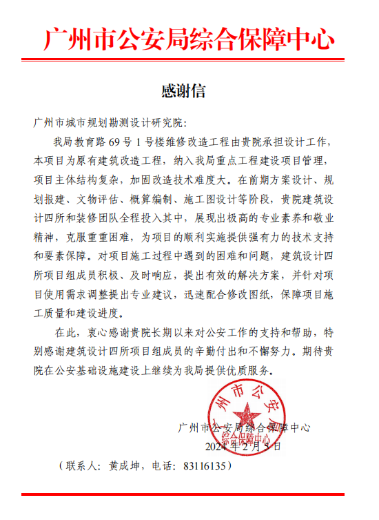 近日,廣州市公安局綜合保障中心發(fā)來(lái)感謝信,衷心感謝規(guī)劃院和我公司對(duì)教育路 69 號(hào) 1 號(hào)樓維修改造工程設(shè)計(jì)工作的支持,對(duì)我公司裝修設(shè)計(jì)團(tuán)隊(duì)在室內(nèi)方案設(shè)計(jì)及施工圖設(shè)計(jì)階段展現(xiàn)出的專業(yè)能力和敬業(yè)精神,保障了項(xiàng)目...