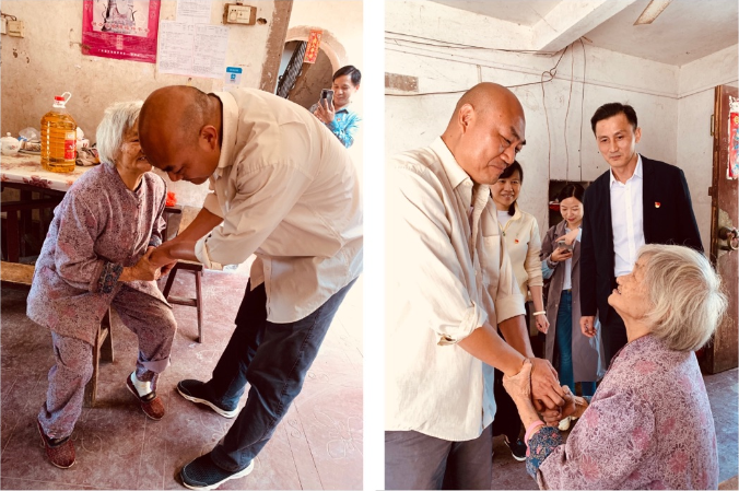 萬(wàn)錦英老人家中有三口人,其 53歲的兒子在外打工的同時(shí)要照顧視力一級(jí)殘疾的孫子,所以老人在黎塘村老屋的家中常常是一個(gè)人居住,平時(shí)飲食起居全靠老人自己。蔡慶立同志駐村后經(jīng)常關(guān)心老人的身體生活狀況,噓寒問(wèn)暖,甚至為老人量腳上網(wǎng)購(gòu)買合適的鞋;老人屋后出入的木橋破舊,存在安全隱患,駐村工作隊(duì)為老人籌資修建了結(jié)實(shí)的鐵板橋和護(hù)欄。老人拉著前來(lái)探望她的陳蓉書(shū)記,眼含熱淚,對(duì)幫扶單位和駐村工作隊(duì)一再表示感謝。老人腰腿不好,我們離開(kāi)時(shí)鎖好她家后門不讓她送,她堅(jiān)持走出二樓門外,站在新修的鐵橋邊,依依不舍目送我們離開(kāi)……