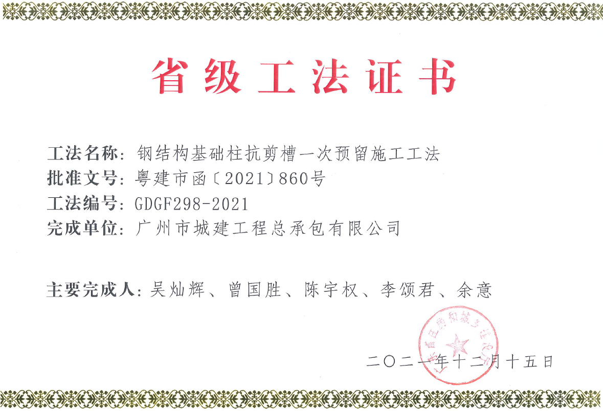 鋼結(jié)構(gòu)基礎(chǔ)柱抗剪槽一次預(yù)留施工工法證書
