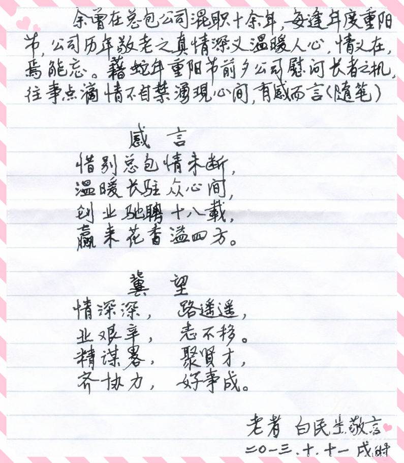 感言:惜別總包情未斷,溫暖長(zhǎng)駐眾心間,創(chuàng)業(yè)馳騁十八載,贏來花香溢四方。